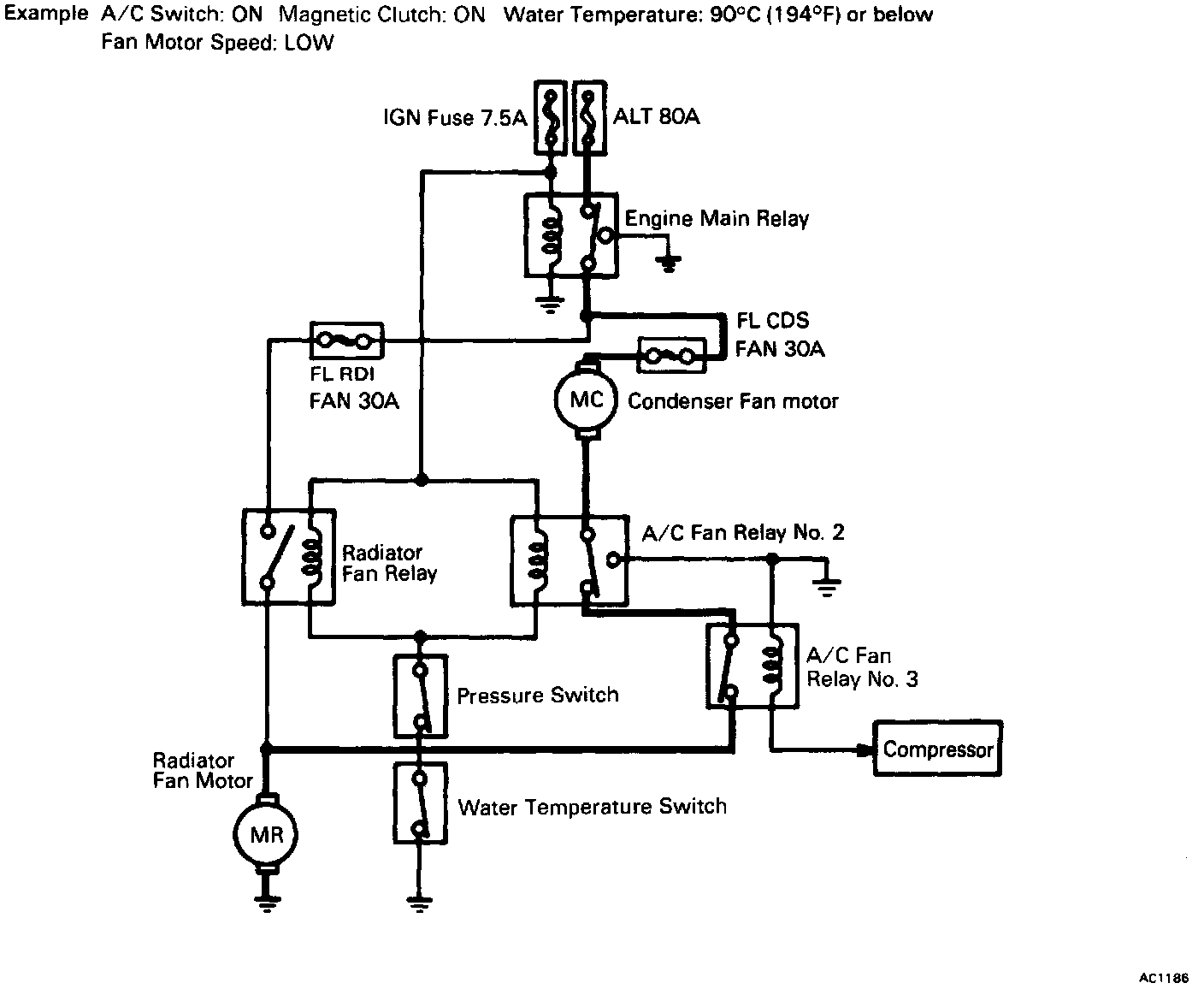 NOTE: The fan motor operates at two speeds depending on the water temperature and the A/C switch.