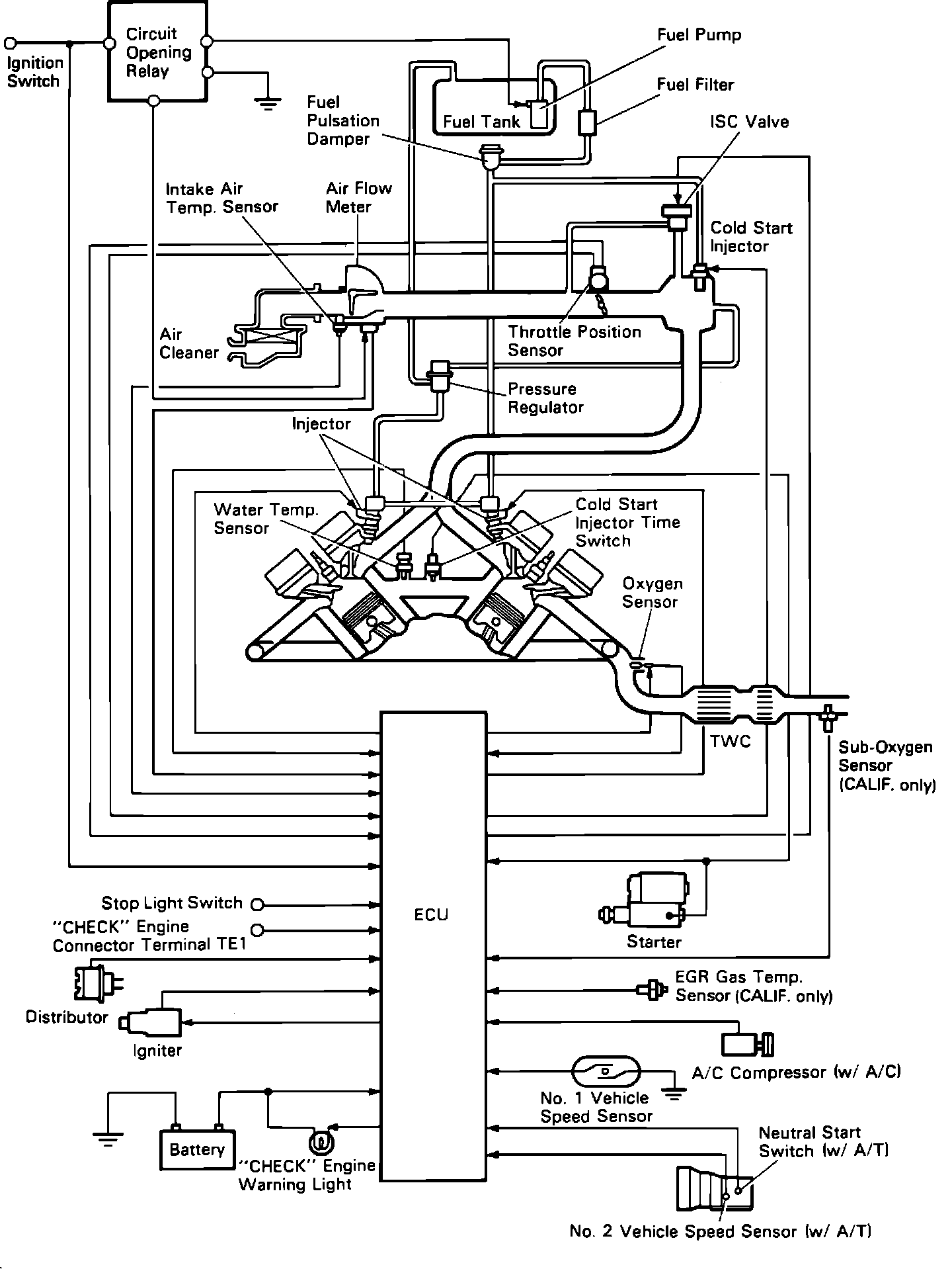 The Toyota Computer Control System (TCCS) is the central control for electronic fuel injection (EFI), electronic spark advance (ESA), idle speed control (ISC) and exhaust gas recirculation (EGR). The electronic control unit (ECU) monitors engine intake air volume, intake air temperature, coolant temperature, engine rpm and exhaust oxygen content, and regulates engine operation. The TCCS has a self-diagnostic function that helps find malfunctions or abnormalities in the system.