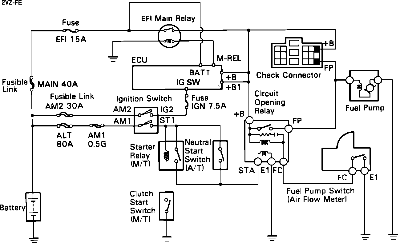 The EFI Main Relay, located in the fuse panel on the LH side of the engine compartment, serves as a source of battery power for several components including the Circuit Opening Relay, (which powers the Fuel Pump), the Fuel Pressure Up VSV and the ECU. The EFI Main Relay is supplied battery current through the EFI fuse and is energized by a signal from the M-REL terminal of the ECU. The ECU receives relay input at terminals +B and +B1.