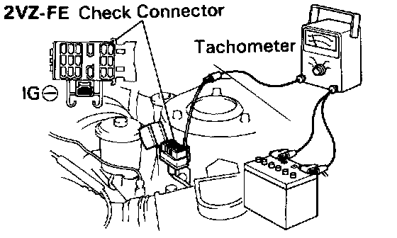 b. Connect the test probe of a tachometer to terminal IG (-) of the check connector.