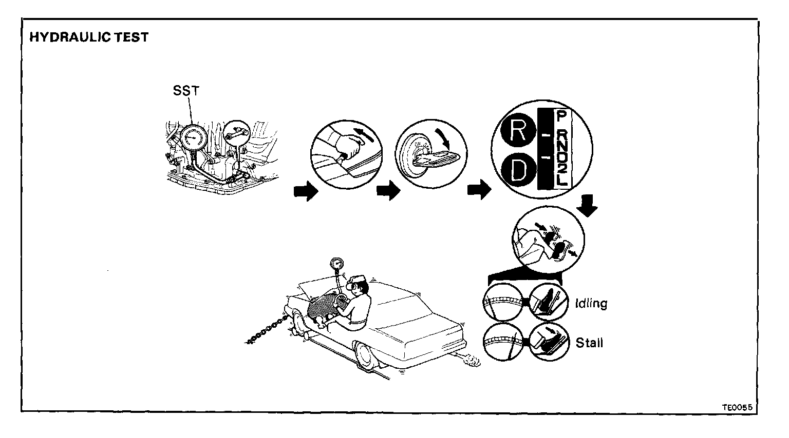 - The line pressure test should always be carried out in pairs. One should observe the conditions of wheels or wheel stoppers outside the vehicle while the other is performing the test.