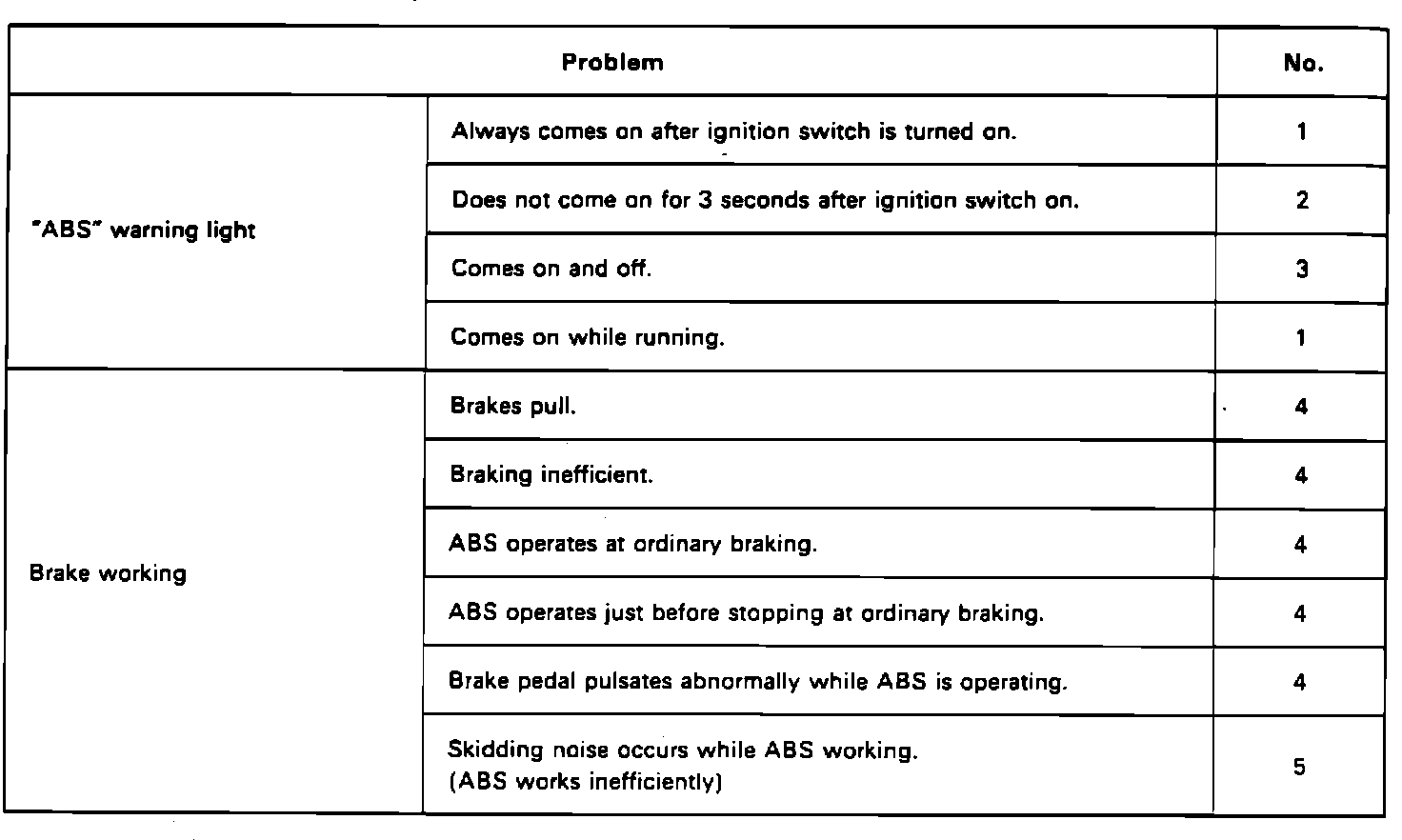 After checking the operation of the "ANTILOCK" warning light and checking the operation of the brake system on a test drive, refer to the chart for the correct symptoms displayed by the vehicle. The number (N0.) column indicates the DIAGNOSTIC PROCEDURE where testing should start.