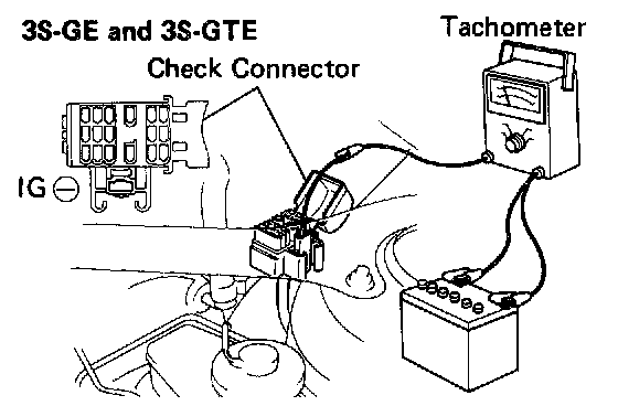 b. Connect the test probe of a tachometer to terminal IG (-) of the check connector.