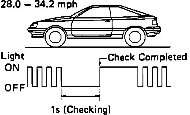 While driving the vehicle at about 28.0-34.2 mph in a straight line, the warning light should turn on after a one second delay. If the warning light turns on while the vehicle is within the specified speed range, the check is completed. NOTE: When the vehicle speed is not within the specified range and the warning light blinks again, the sensor rotors are OK.