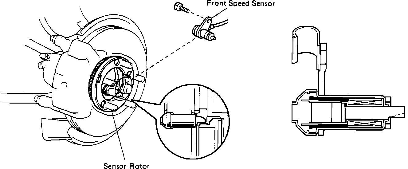 The sensor sends wheel speed information to the ABS computer where the speed signals are used to determine when anti-lock control is required. Each wheel speed sensor consists of a magnet surrounded by a coil of wire. Mounted next to each sensor is a toothed ring that rotates along with the front brake disc .