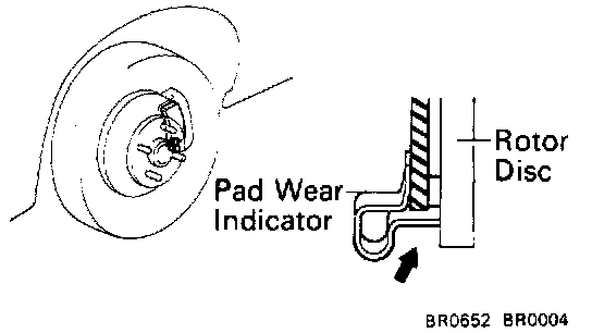 NOTE: If a squealing noise occurs from the brakes while driving, check the pad wear indicator. If there are traces of the indicator contacting the rotor disc, the brake pad should be replaced.