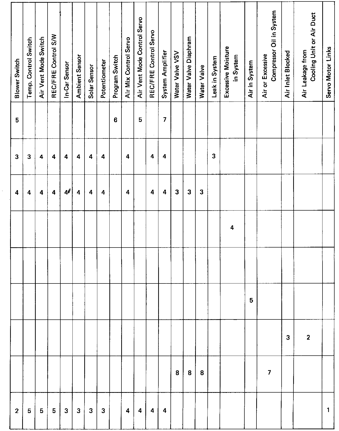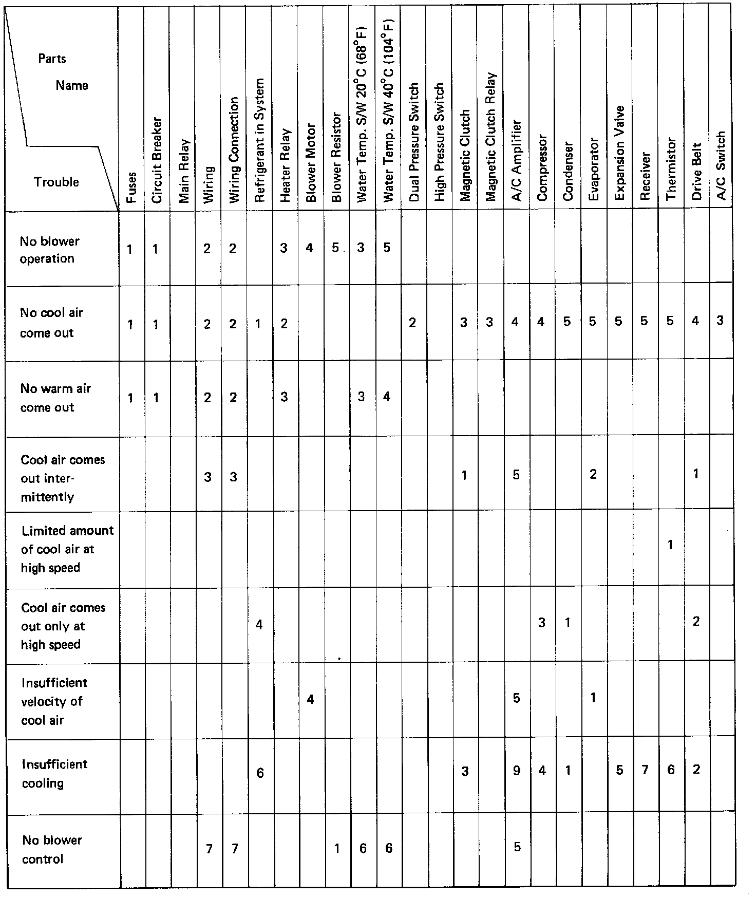 You will find the troubles easier using the table. In this table, each number shows the priority of causes in troubles. Check each part in order. If necessary, replace these parts.