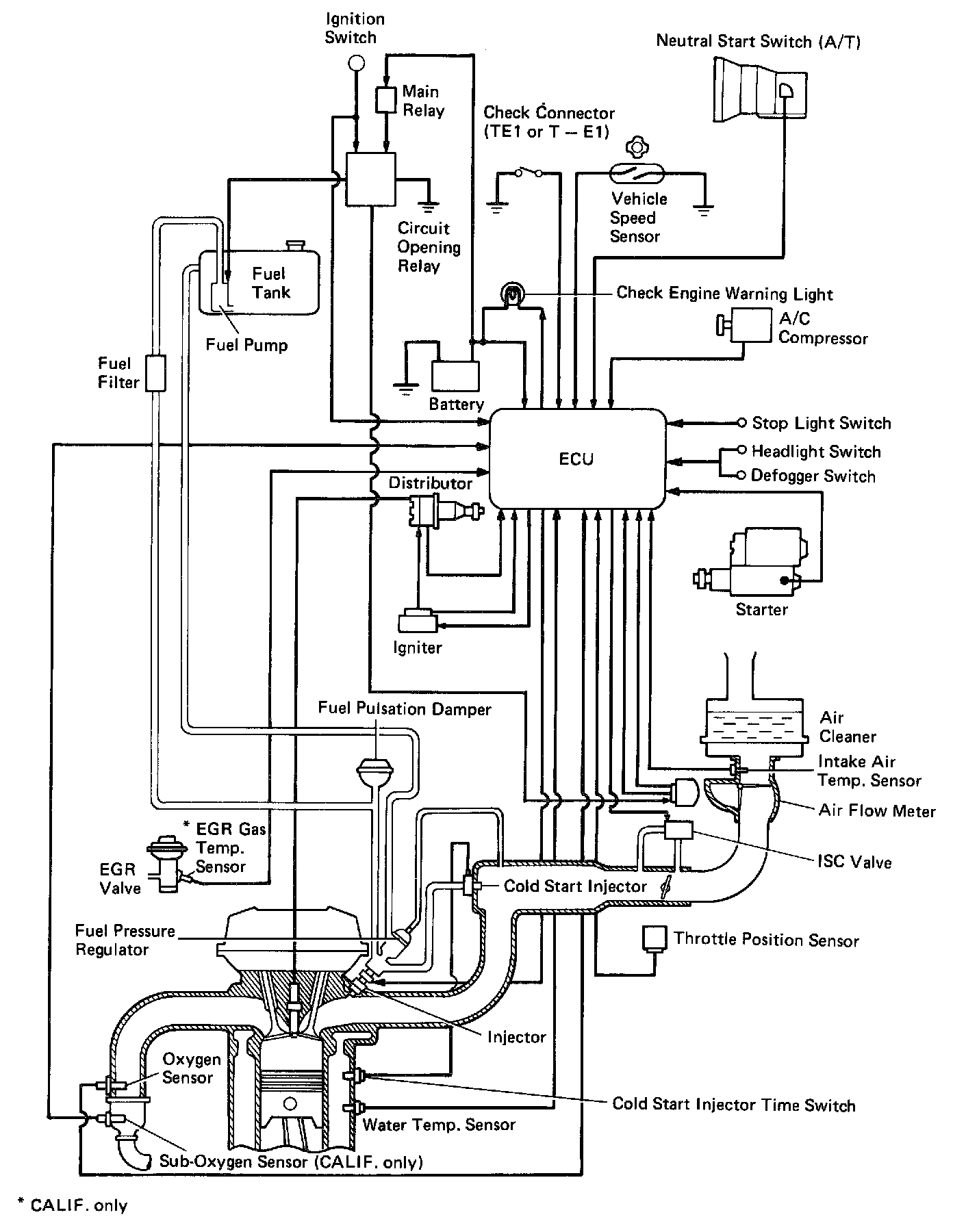 Celica 3S-FE engines are equipped with a Toyota Computer Control System (TCCS) which centrally controls the EFI, Electronic Spark Advance (ESA), Idle Speed Control (ISC), Diagnosis systems, etc. by means of an Electronic Control Unit [(ECU) - formerly EFI computer] employing a microcomputer.