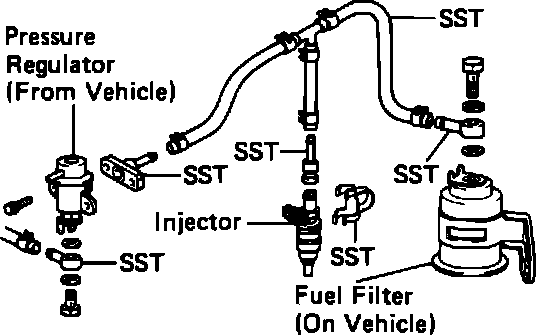 2. Utilizing special service tools (SST), connect the injector to the fuel filter and the Fuel Pressure Regulator.