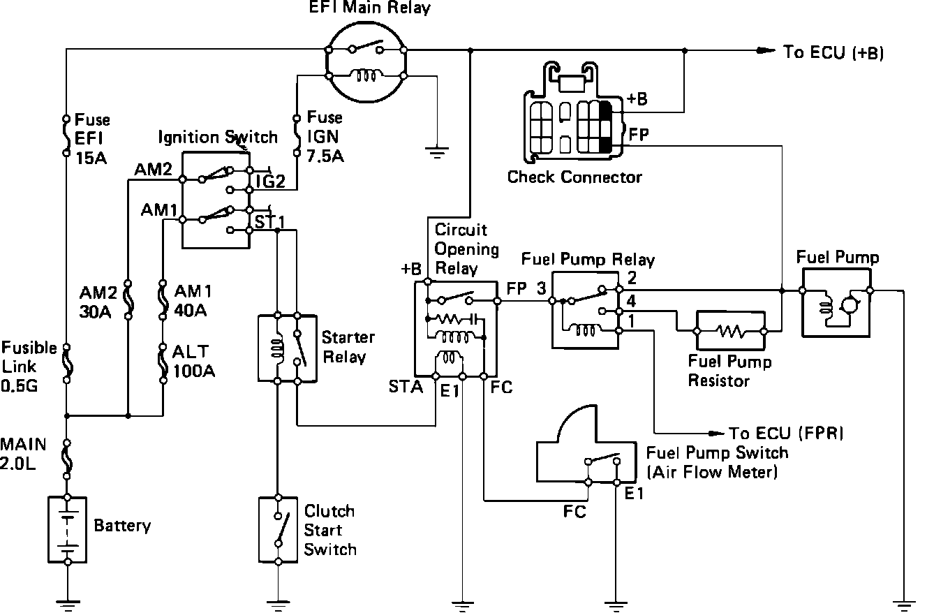 The Circuit Opening Relay, located near the ECU, is responsible for providing power to the Fuel Pump. Power is applied to the STA terminal of the relay from the starter when the ignition switch signals cranking mode. This allows the fuel pump to operate until the engine starts and runs under its own power. A signal from the Air Flow Meter (FC), keeps the relay closed until the ignition switch is turned OFF and de-energizes the EFI Main Relay. The fuel pump operation is then interrupted.