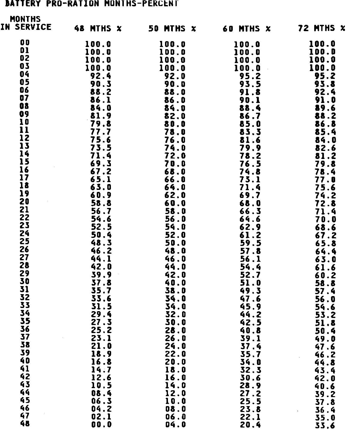 Warranty - Battery Replacement Proration Chart