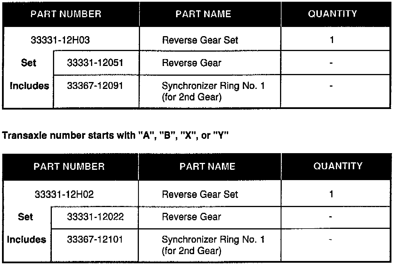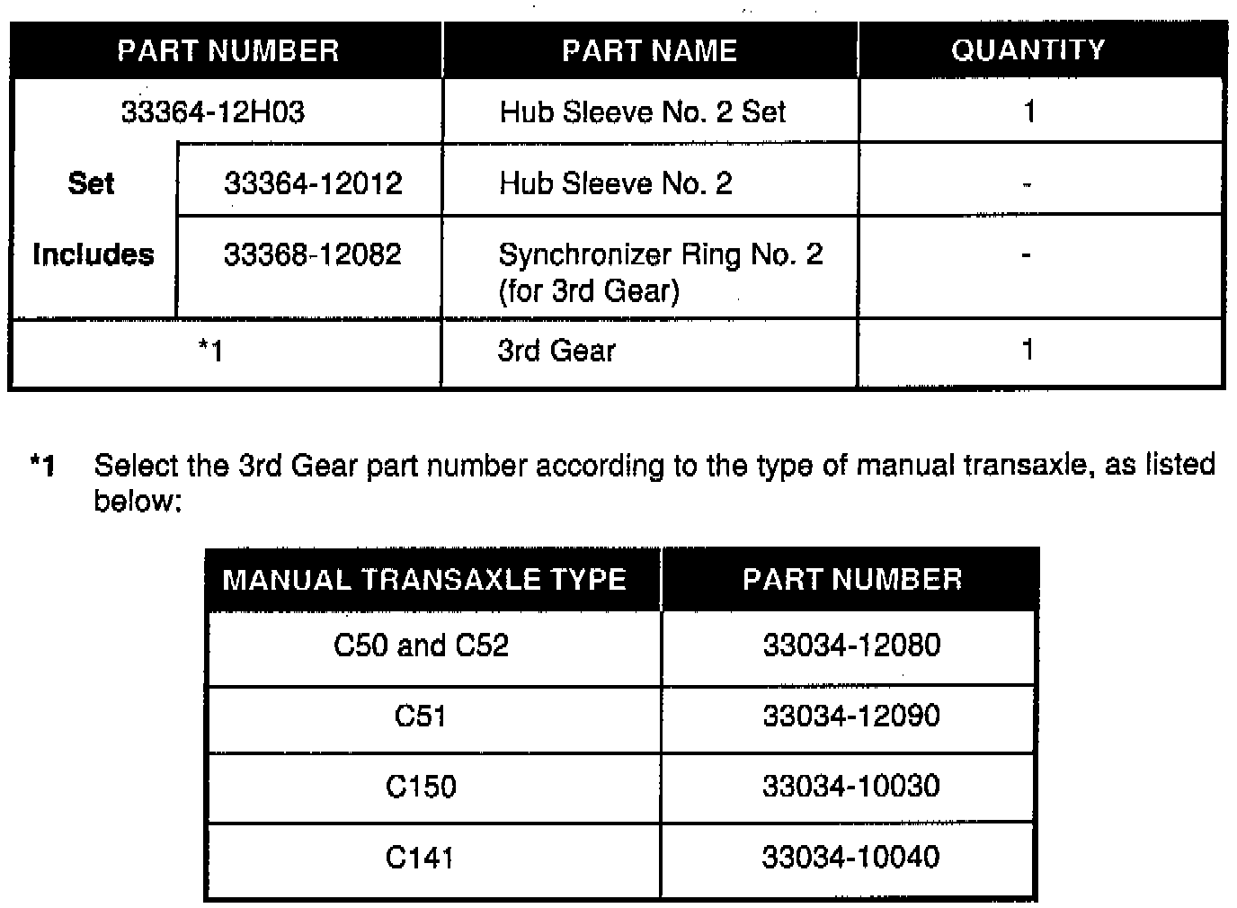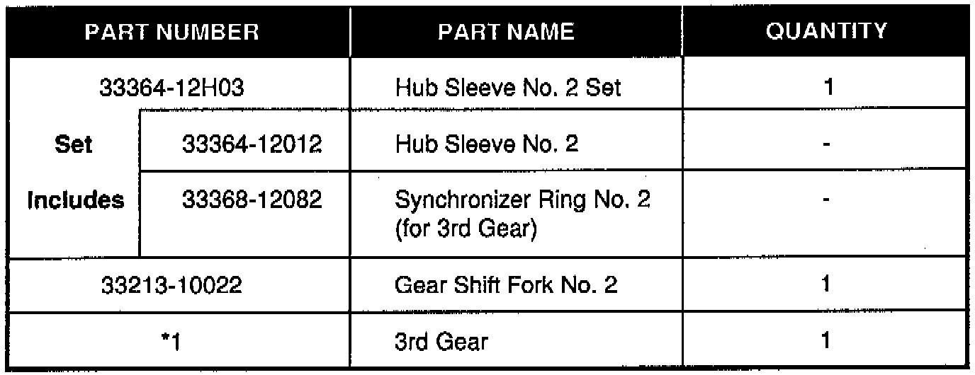 When replacing the Hub Sleeve No. 2 or Reverse Gear on C5 #, C14 #, and C15 # manual transaxles, use the applicable parts replacement sets listed below along with applicable 2nd or 3rd gear (when listed). The parts listed must be replaced as a set due to the adoption of an uneven pitch chamfer for 2nd and 3rd gears.