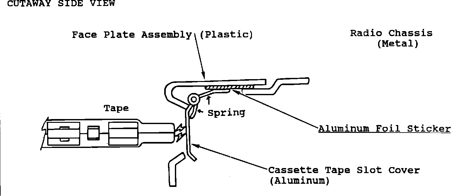 To prevent electrostatic discharge from disabling the cassette player, an aluminum foil sticker has been added to the inside of the face plate assembly: This sticker provides a pathway for the electrostatic discharge originating from a cassette to go directly to the audio chassis and avoid any damage to the printed circuit board and components.