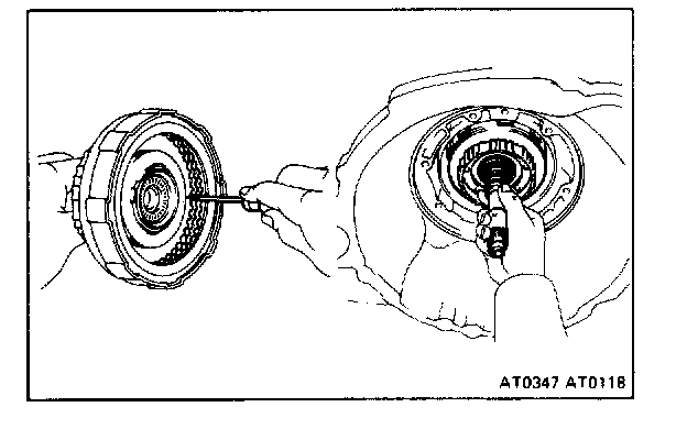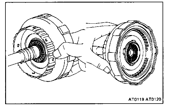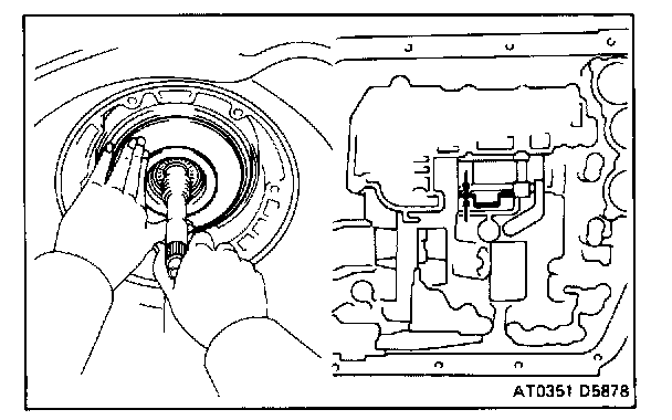 c. Hold the sun gear input drum and rotate the input shaft to mesh the hub with the clutch discs of the forward clutch.