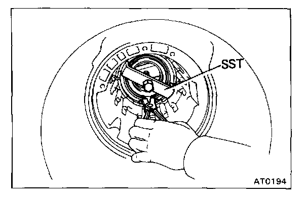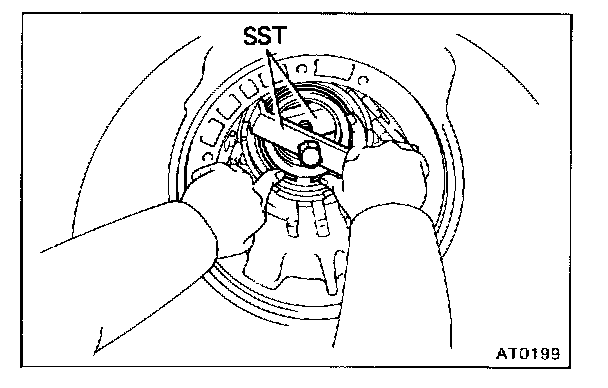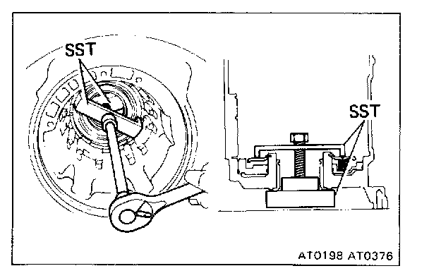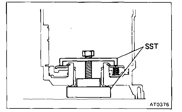Gradually and evenly tighten the bolt to compress the springs, being careful not to damage the transmission case with SST.