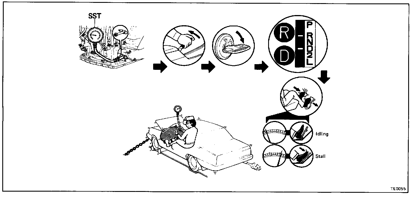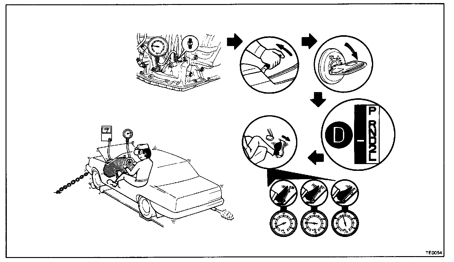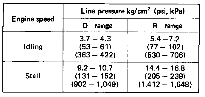 c. Shift into D range, step down strongly on the brake pedal with your left foot and while manipulating the accelerator pedal with the right foot, measure the line pressure at the engine speeds specified in table.