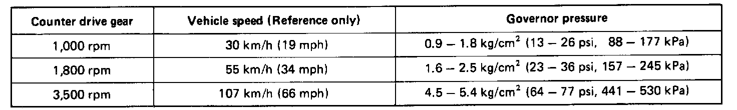 c. Shift into D range and measure the governor pressures at the speeds specified in the table.