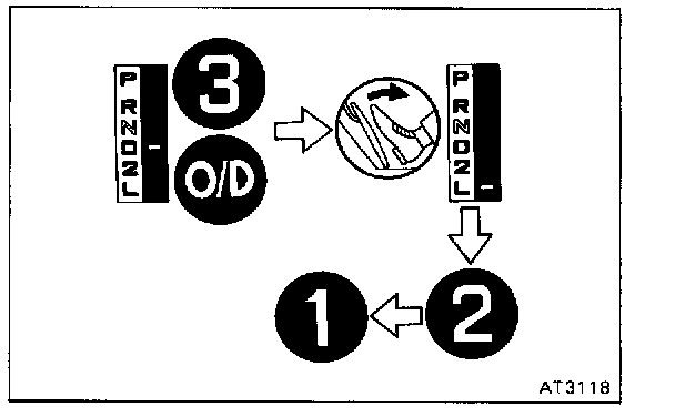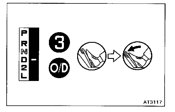 d. While running in the 3rd gear or O/D of D range, check to see that the possible kick-down vehicle speed limits for the 3-1, 3-2, O/D-3 and O/D-2 kick-downs conform to those indicated in the automatic shift schedule.