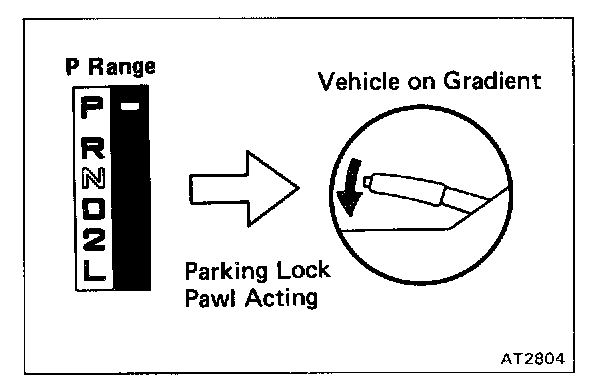 Stop the vehicle on a gradient (more than 9%) and, after shifting into P range, release the parking brake. Then check to see that the parking lock pawl prevents the vehicle from moving.