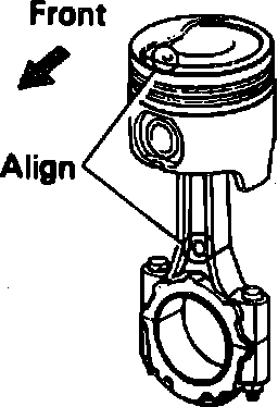 Pistons are available in standard and oversize of .050 inch. If piston bore is not within specifications, replace piston and/or cylinder block. When assembling piston onto connecting rod, ensure mark on top of piston and mark on connecting rod are on same side, Fig. 22. When installing piston and connecting rod assembly, ensure mark on top of piston is facing toward front of engine.