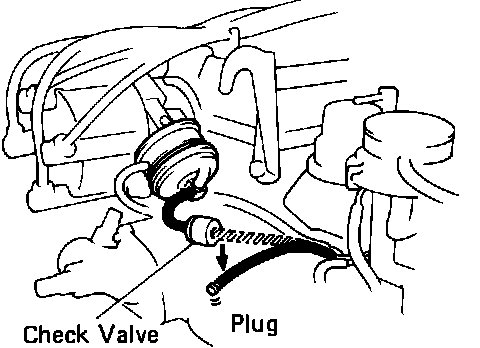 10. Disconnect the vacuum hose from the black side of the check valve, (Located near the distributor), and plug the hose end. Fig. 78