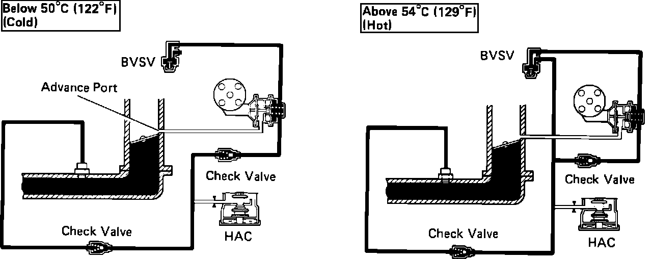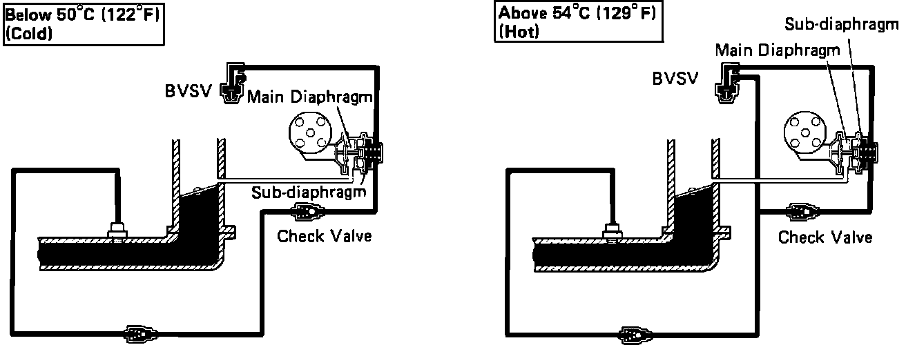 The sub-diaphragm port receives manifold vacuum when coolant temperatures are below 122°F (50°C) and above 129°F (54°C).