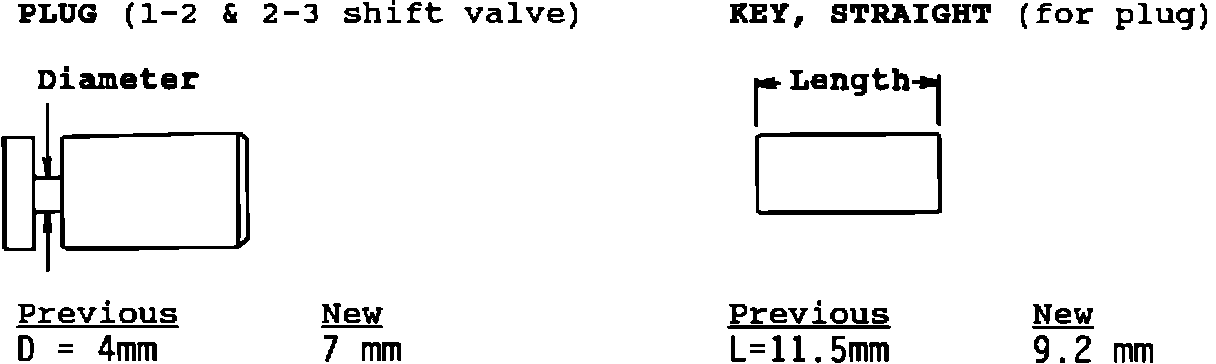For improved durability, the 1-2 and 2-3 shift valve plugs (and straight key) have been changed as shown below.