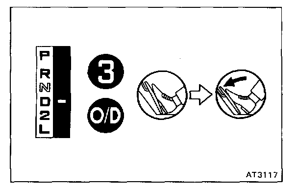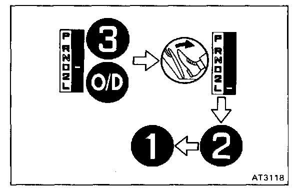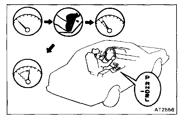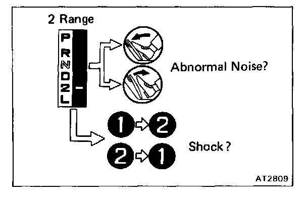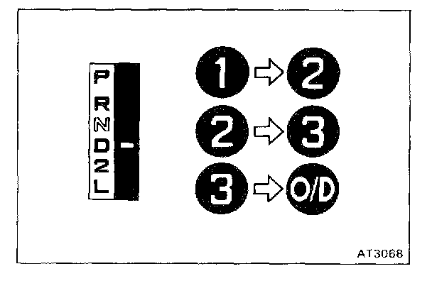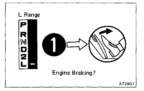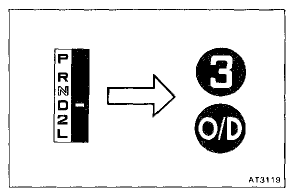 f. While running more than 60 kph (37 mph) in the O/D of D range, release your foot from the accelerator pedal and shift into L range. Then check to see if the 2 - 1 down-shift point conform to those indicated in the automatic shift schedule. Diagram Information and Instructions