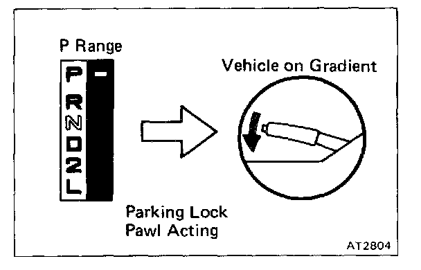 Stop the vehicle on a gradient (more than 9%) and, after shifting into P range, release the parking brake. Then check to see that the parking lock pawl prevents the vehicle from moving.
