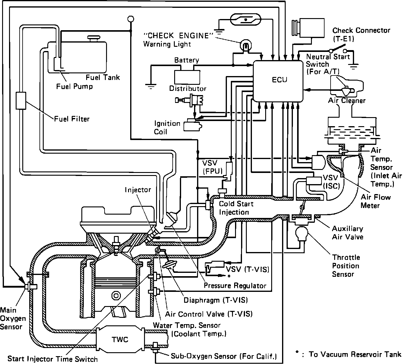 The Toyota Computer Control System (TCCS) is the central control for electronic fuel injection (EFI), electronic spark advance (ESA), idle speed control (ISC) and exhaust gas recirculation (EGR). The electronic control unit (ECU) monitors engine intake air volume, intake air temperature, coolant temperature, engine rpm and exhaust oxygen content, and regulates engine operation. The TCCS has a self-diagnostic function that helps find malfunctions or abnormalities in the system.