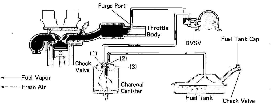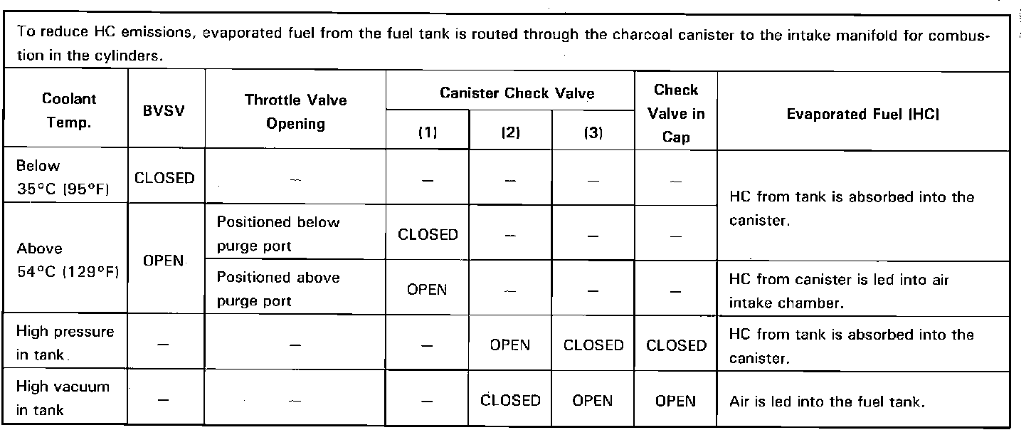 The evaporative emission control system is designed to prevent raw fuel vapors from escaping into the atmosphere by the use of a charcoal canister, bi-metal vacuum switching valve (BVSV), purge port at the intake manifold, and a fuel filler cap. The system holds fuel vapors collected from the fuel system in the charcoal canister where they are stored until the engine warms to 129° F . The BVSV then opens and allows engine vacuum to open a check valve in the charcoal canister. When air is drawn through the canister it opens another check valve in the canister that pulls vapors from the fuel tank. This in turn, pulls fresh air into the fuel tank through the check valve in the fuel filler cap.