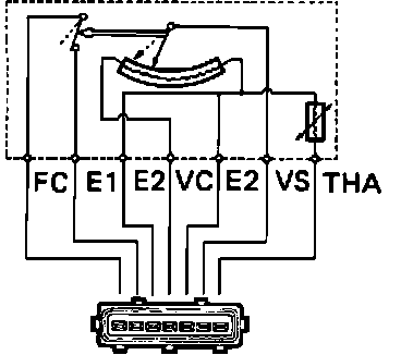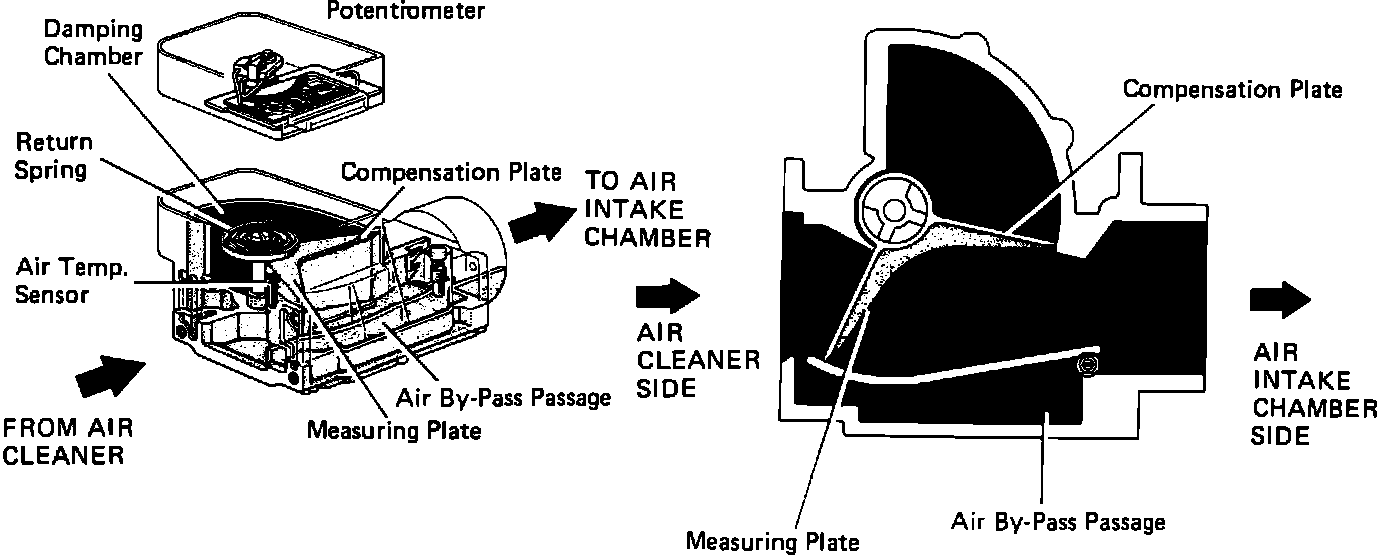 A Bosch vane type airflow meter is mounted in the air induction system near the air cleaner. The airflow meter measures intake air volume, and converts these readings into voltage signals by means of a variable resistor (potentiometer). These voltage signals are then sent to the ECU and used to determine injection duration and proper fuel delivery. When intake air volume is low, the voltage is high; when the intake air volume is high, the voltage signal is approximately zero.