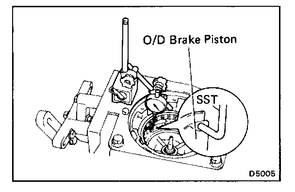 a. Place SST and a dial indicator onto the overdrive brake piston as shown in the figure.
