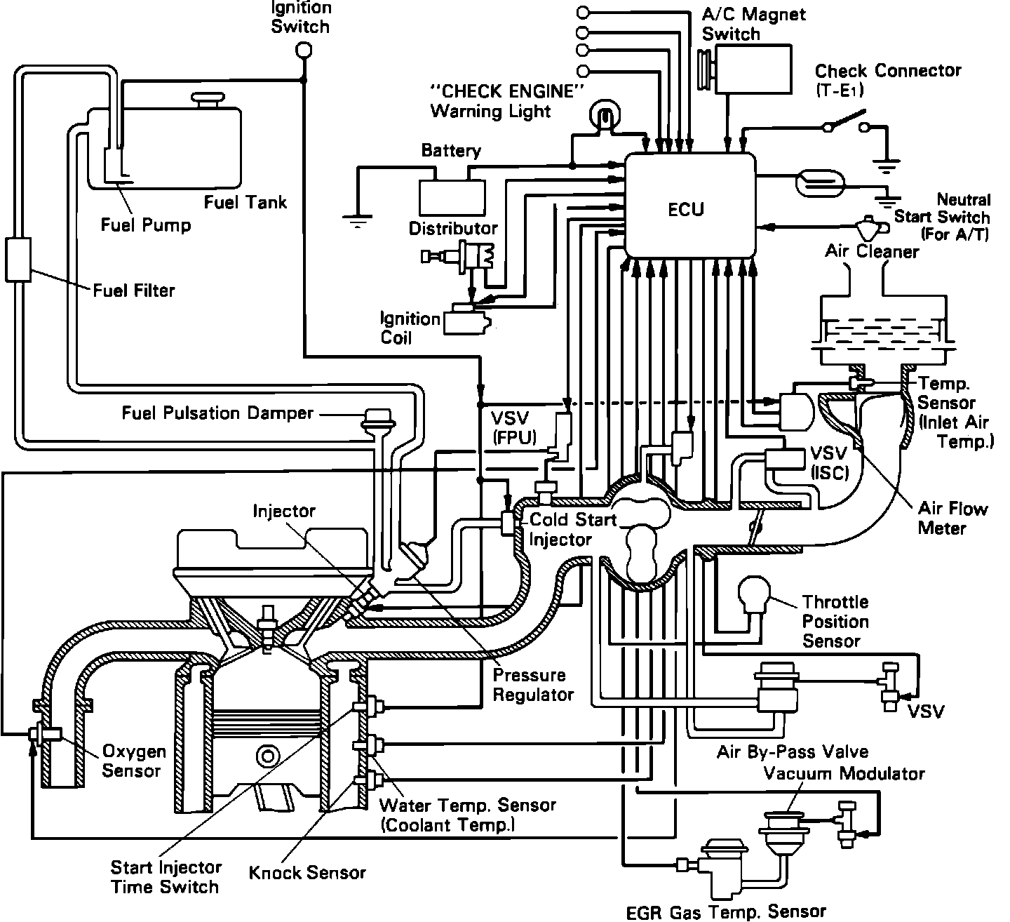 The Toyota Computer Control System (TCCS) is the central control for electronic fuel injection (EFI), electronic spark advance (ESA), idle speed control (ISC) and exhaust gas recirculation (EGR). The electronic control unit (ECU) monitors engine intake air volume, intake air temperature, coolant temperature, engine rpm and exhaust oxygen content, and regulates engine operation. The TCCS has a self-diagnostic function that helps find malfunctions or abnormalities in the system.