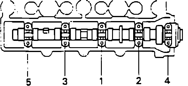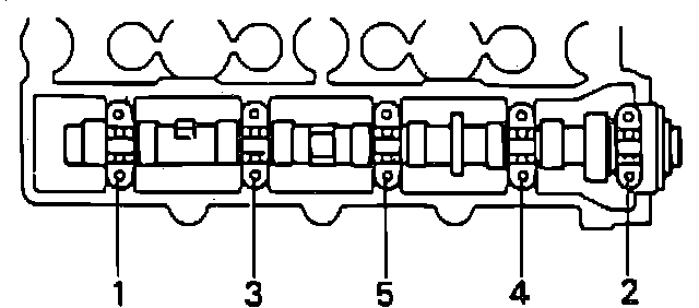 h. Place camshaft in position on the cylinder head. The exhaust camshaft incorporates a distributor drive gear. Apply seal packing No. 08826-0080 or equivalent. Install the bearing caps in their proper locations. Apply a light coat of clean engine oil to the bolt threads and under the bolt heads. Install and uniformly tighten the bearing cap attaching bolts in several passes, in sequence shown in Fig. 5.