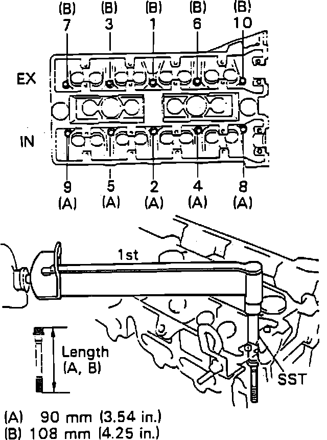 c. Using tool 09205-16010 or equivalent, install and uniformly tighten the cylinder head attaching bolts in several passes to 22 ft. lbs. in sequence shown in Fig. 4. The bolts indicated (A) are 3.54 inches long and the bolts indicated (B) are 4.25 inches long. Ensure the correct size bolt is installed or cracking of the cylinder head will result. If any of the attaching bolts does not meet the torque specification, replace bolt.