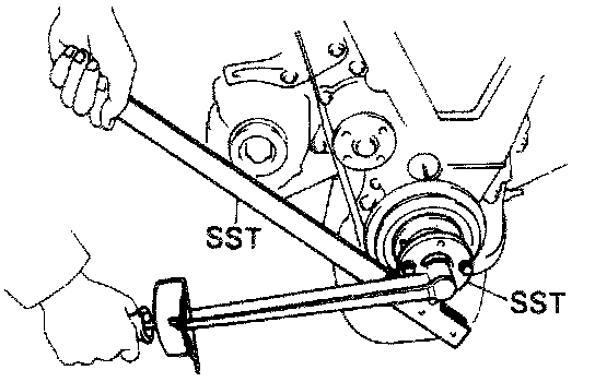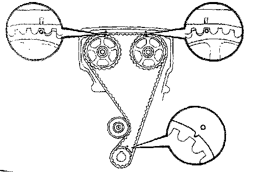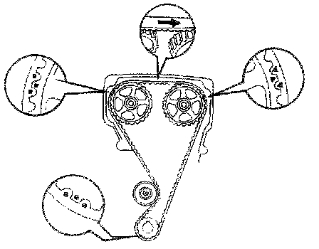 (c) Check that each pulley aligns with the timing marks as shown in the figure. If the marks do not align, remove the timing belt and reinstall it.