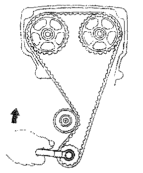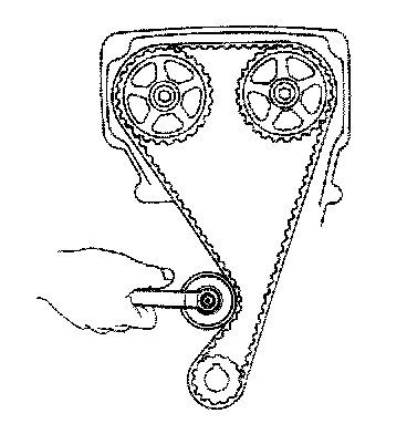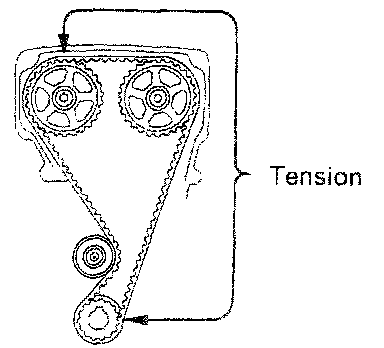 Install the timing belt, insuring the tension between the intake camshaft and crankshaft timing pulleys.