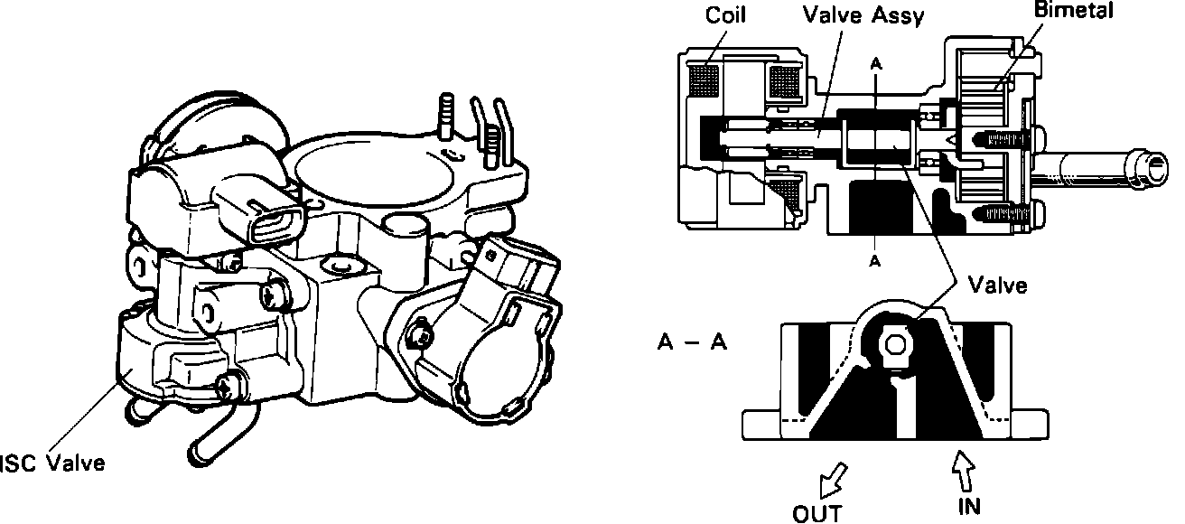 The ECU receives input from various sensors and controls idle speed through the idle speed control valve. The ISC Valve provides an air bypass around the throttle valve with an electric motor that rotates a flap in the air passage. The ISC Valve has battery voltage applied to it and grounds back through the ECU via terminals RSC and RSO. There is a bimetal thermal valve on the end of the ISC Valve that provides high idle at start-up.