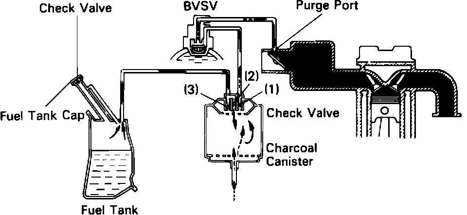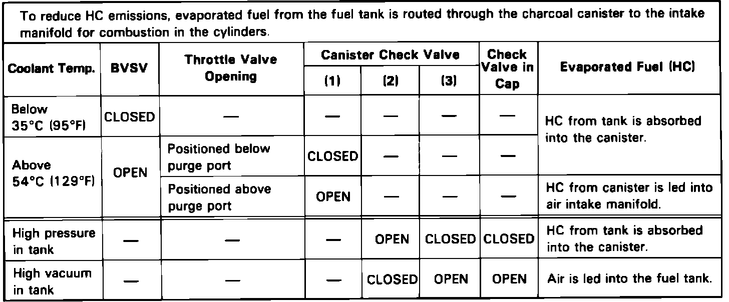 The evaporative emission control system is designed to prevent raw fuel vapors from escaping into the atmosphere by the use of a charcoal canister, bi-metal vacuum switching valve (BVSV), a purge port at the intake manifold, and a fuel filler cap. The system holds fuel vapors collected from the fuel tank in the charcoal canister where they are stored until the engine warms to 129° F . The BVSV then opens and allows engine vacuum to open a check valve in the carbon canister. When air is drawn through the canister another check valve inside the canister opens and that pulls air from the fuel tank, this in turn pulls air into the fuel tank through the check valve in the fuel filler cap.
