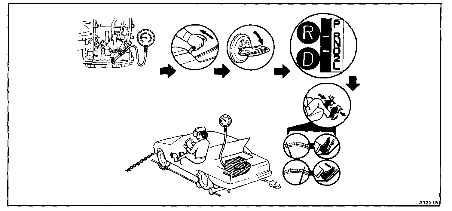 c. Shift into D range, step down strongly on the brake pedal with your left foot and while manipulating the accelerator pedal with the right foot, measure the line pressure at the engine speeds specified in table.