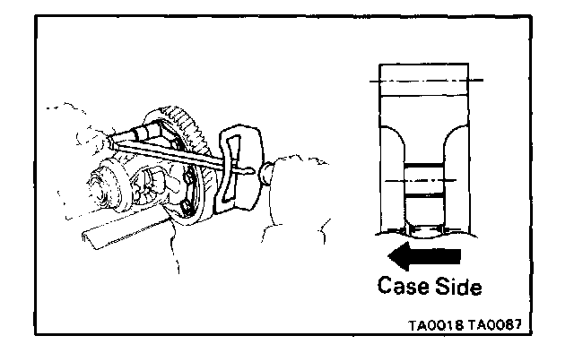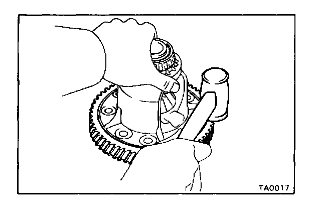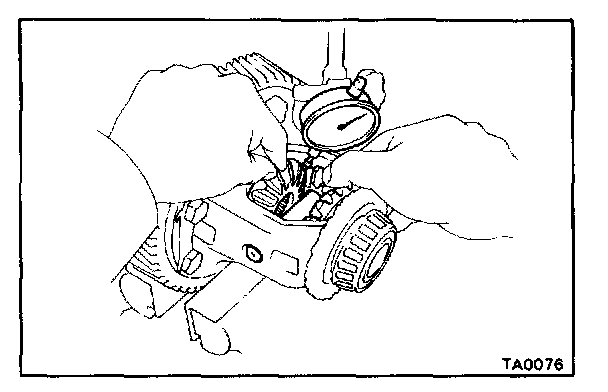 Measure the side gear backlash while holding one pinion gear toward the case.