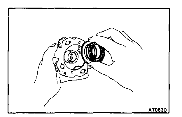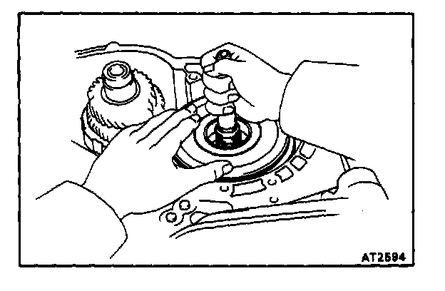 d. Hold the input shaft, and lightly press the oil pump body to slide the oil seal rings on the stator shaft through the direct clutch drum.