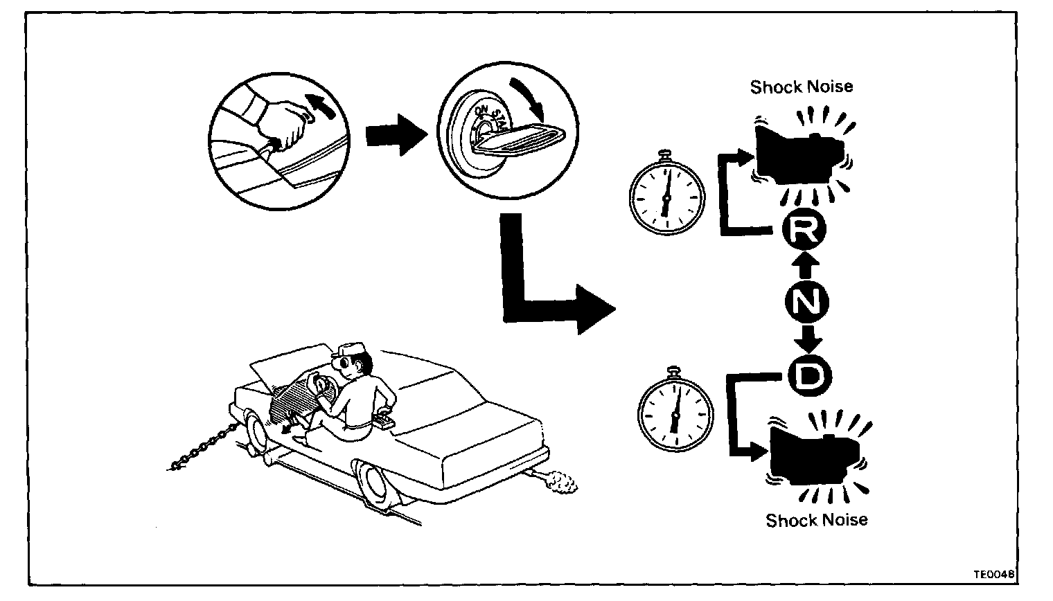 c. Shift the shift lever from N to D range. Using a stop watch, measure the time it takes from shifting the lever until the shock is felt.