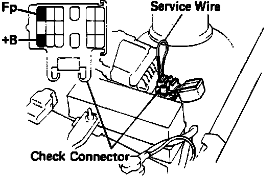 3. Using a service wire, short terminals +B and FP on the engine check connector. The fuel pump should operate.