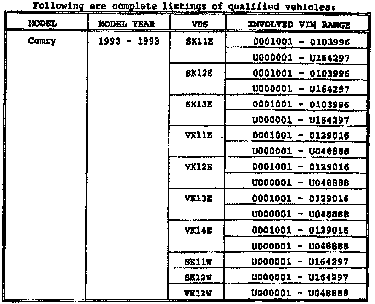 ^ A SUMMARY LISTING OF THE INVOLVED VEHICLES SOLD BY YOUR DEALERSHIP IS ENCLOSED. THIS LISTING MUST BE UTILIZED TO CALCULATE REPLACEMENT PARTS REQUIREMENTS BY MODEL. YOUR INITIAL PARTS ORDERS MUST NOT BE MORE THAN 5% OF YOUR INVOLVED VEHICLES. SUBSEQUENT ORDERS MUST BE CALCULATED TO MEET ACTUAL WEEKLY DEMAND REQUIREMENTS IN ORDER TO ENSURE CONTINUED GOOD AVAILABILITY OF PARTS.