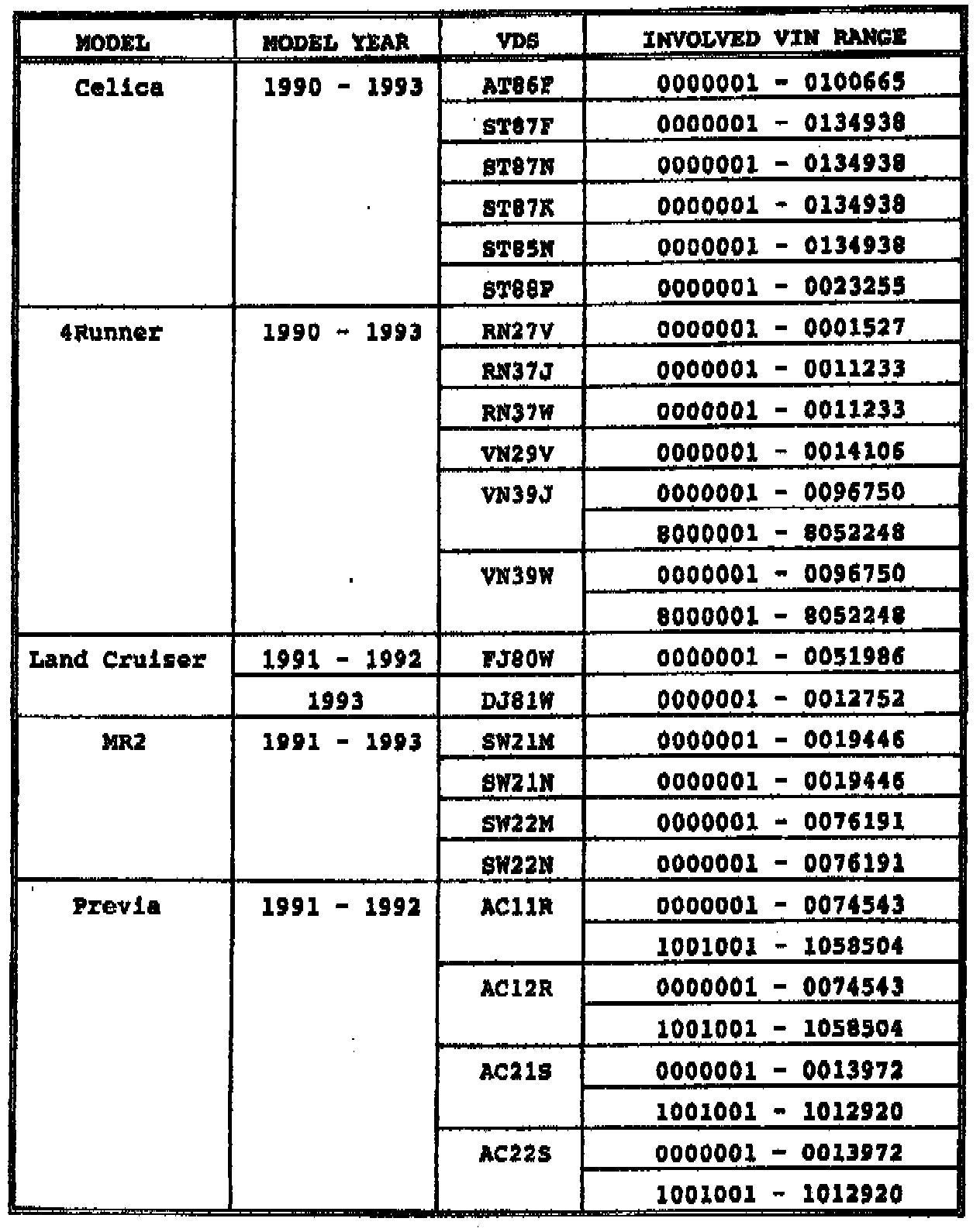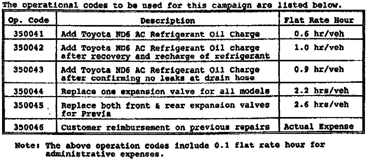 Toyota will initiate a Special Service Campaign to inspect the air conditioning system, inject an anti-corrosion lubricant (Toyota ND6 AC Refrigerant Oil Charge) or, if necessary, replace the air conditioning expansion valve on certain 1989-1993 Toyota models.