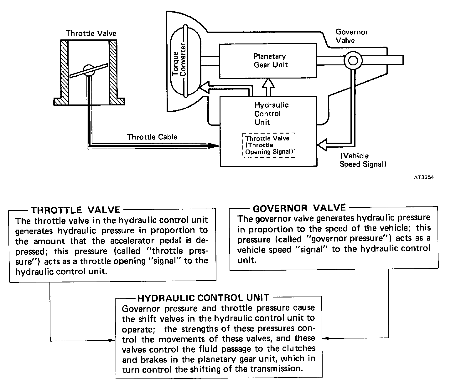 The conventional automatic transmission operates by mechanically converting vehicle speed into governor pressure, and throttle opening into throttle pressure, and using these hydraulic pressures to control the operation of the clutches and brakes in the planetary gear unit, thus controlling the timing of up-shift and down-shift of the transmission. This is called the "hydraulic control method."