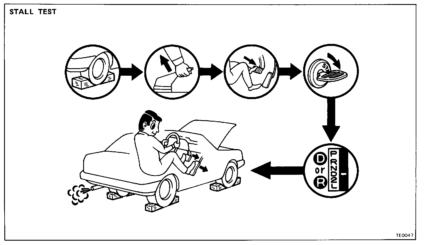 - The stall test should always be carried out in pairs. One should observe the conditions of wheels or wheel stoppers outside the vehicle while the other is performing the test.