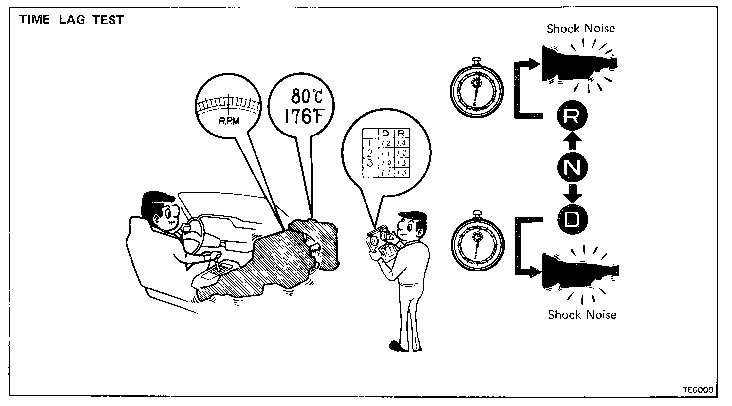 c. Shift the shift lever from N to D position. Using a stop watch, measure the time it takes from shifting the lever until the shock is felt.